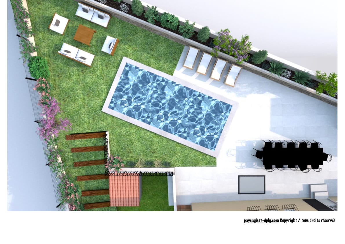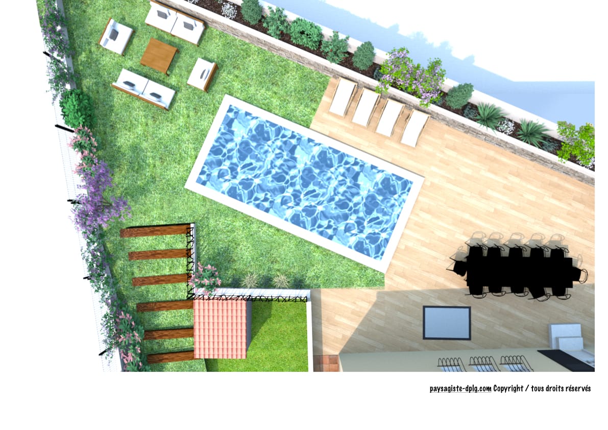Projection réalisé dans la cadre d’une projet d’aménagement d’un extérieur avec création d’une piscine et terrassement d’un terrain en deux niveau sur Aix-En-Provence par architecte Paysagiste. Les travaux prévoit l‘intégration d’une piscine de 3 par 5 m sous la forme d’une coque avec un mur de soutènement pour retenir la terre et le poids de la piscine et préserver le niveau intérieur, une zone repas est dédié à la fonction jardin d’été car positionner dans un coins plutôt ombragé et sans vie à vie.